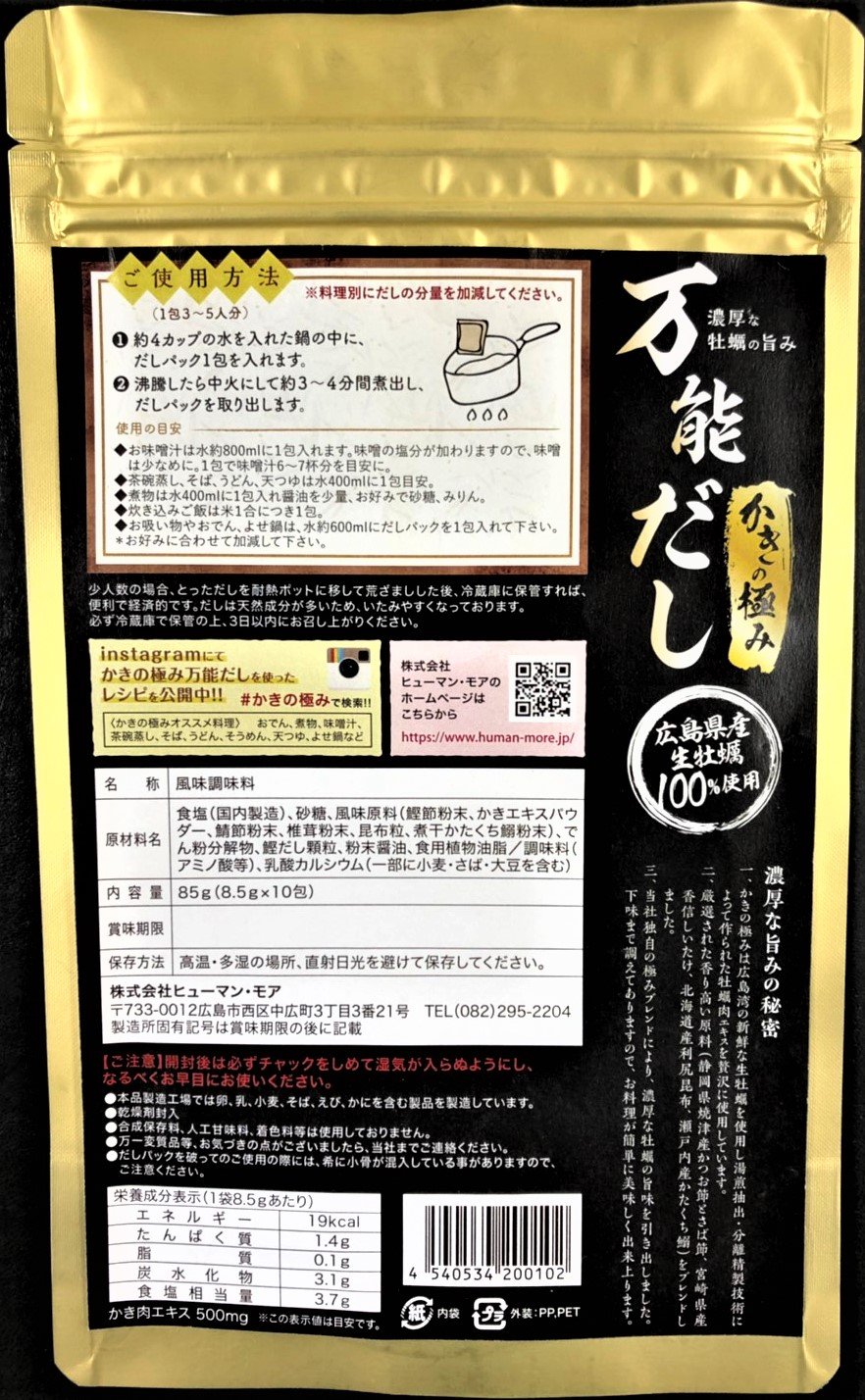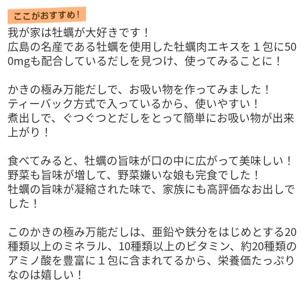 かきの極み万能だしは、牡蠣のもつ栄養素と旨みを広めていきたいとの思いで作られた健康食品で使用されている牡蠣肉エキスを500mg配合した出汁パックです。